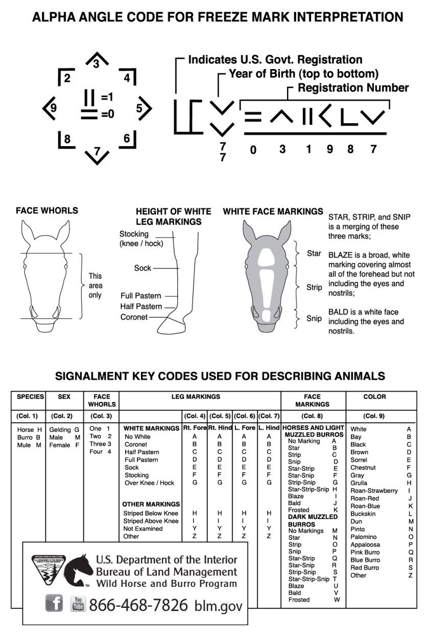 Photo: A mustang with a freeze brand that reads BLM 09 051649. This indicates the horse belongs to the Federal government, was born in 2009 and branded at a BLM facility in Oregon. Source: BLM / Wikipedia Document: A BLM key code for deciphering freezemarks. Source: BLM