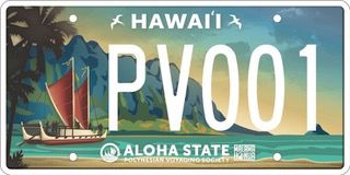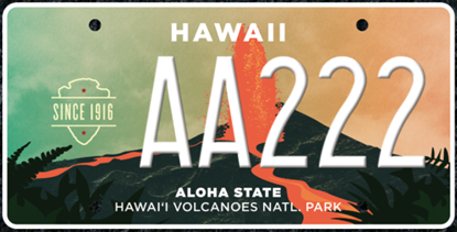Hawaii offers some striking plates. Left: "Polynesian Voyaging" won Best New Plate for 2022 from the Automobile License Plate Collector’s Association. Right: Hawaii Volcanoes National Park plate.