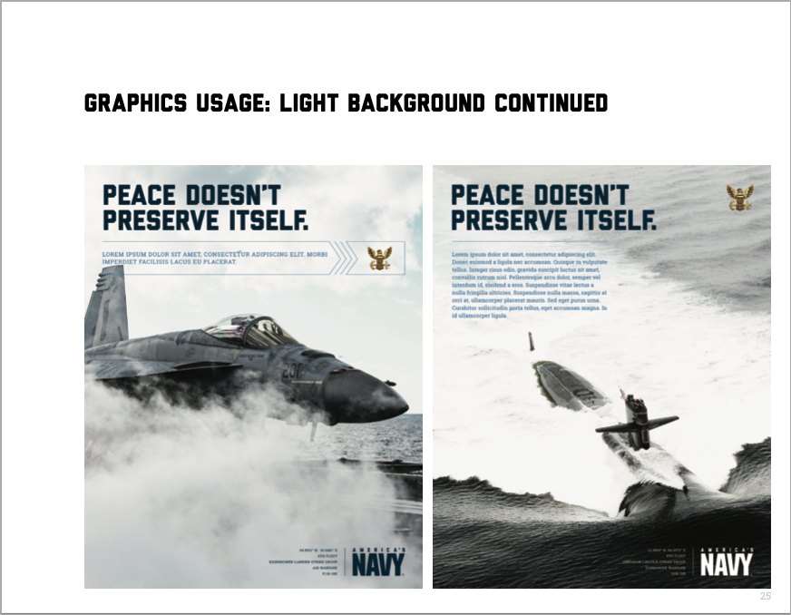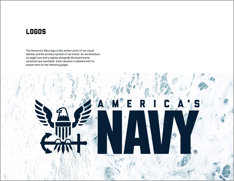 After reading through the Army’s comprehensive brand guidelines, it is especially informative to see how it compares and contrasts to its sea-based brethren, the U.S. Navy. The Navy’s brand guidelines doc shown here is from 2019, and while it is only half the length of the Army’s guidelines document it is equally slick and well designed and is organized in a similar way.