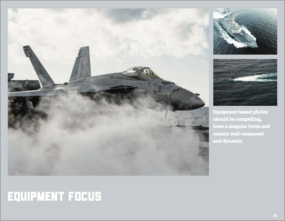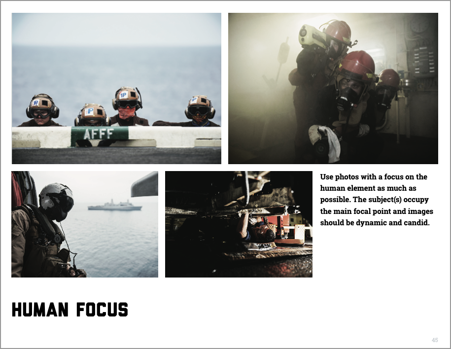 Compositions are to be clear and direct, and free of any dramatic effects, and notes that photographs “...should feel like an authentic moment, unstaged.” When describing perspective, the photography should provide “...an immersive, dynamic, and authentic window on life inside the U.S. Army, as experienced from a very human, first-person perspective.”