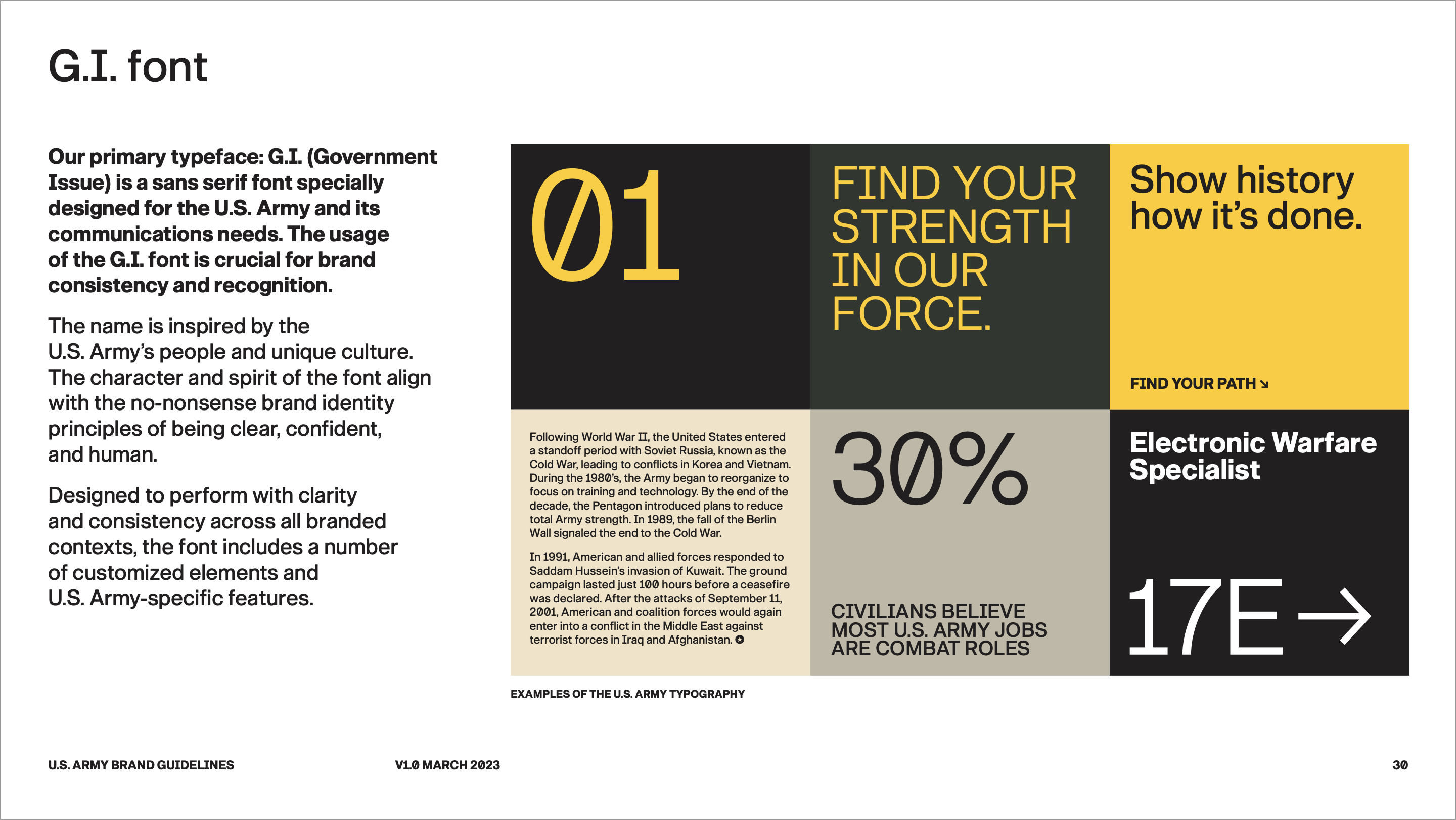 The Army has its own bespoke font, with the name “G.I.” (which seems like a missed opportunity with all the cool terminology available). The document says the name “...is inspired by the U.S. Army’s people and unique culture. The character and spirit of the font align with the no-nonsense brand identity principles of being clear, confident, and human.”