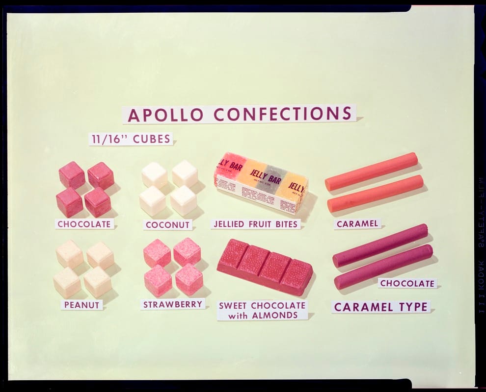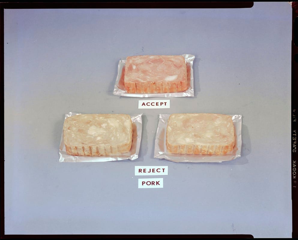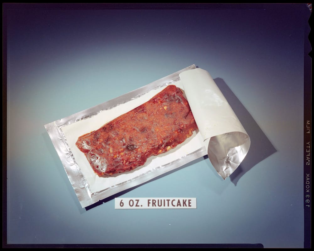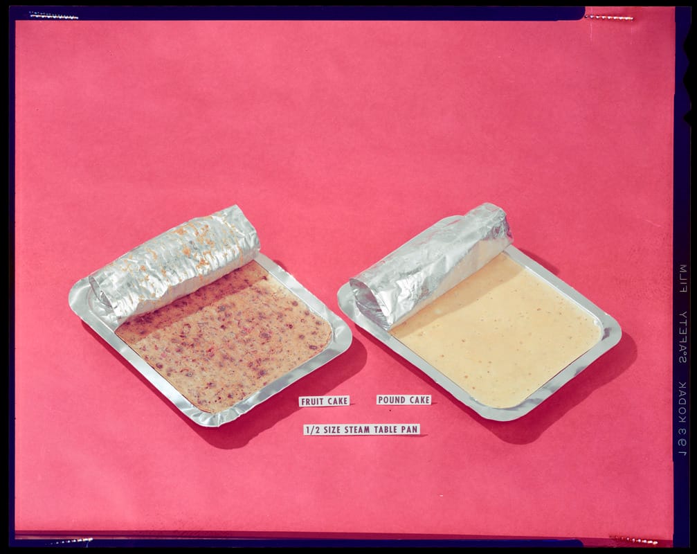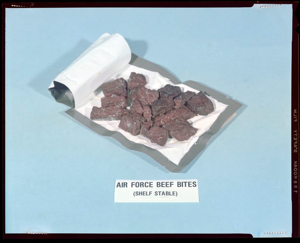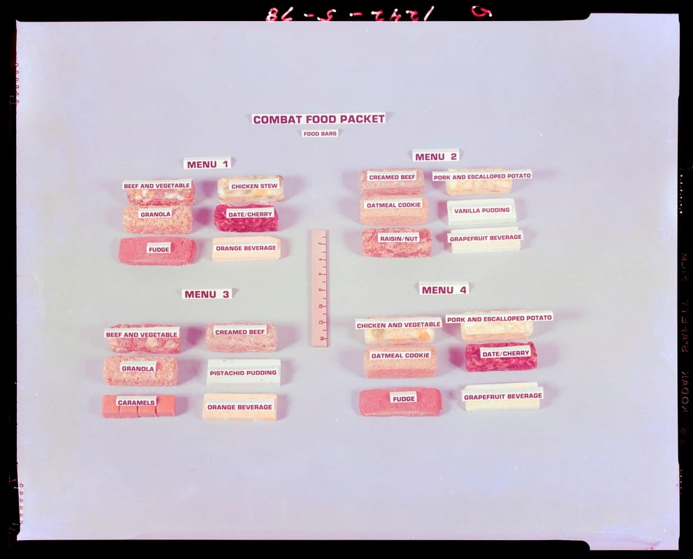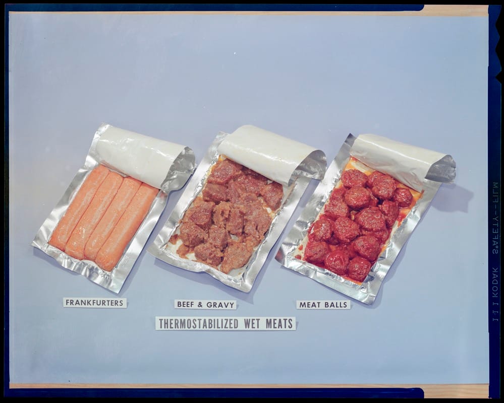 In the photos that feature prototype meals, large sans-serif capital letters spell out such delicious dishes as AIR FORCE BEEF BITES (SHELF STABLE) or FREEZE DRIED RAW PORKCHOPS and even some of the meals prepared for NASA’s Apollo program: BITE SIZE SPACE FOODS. Some of these images could be stills from a Wes Anderson film.