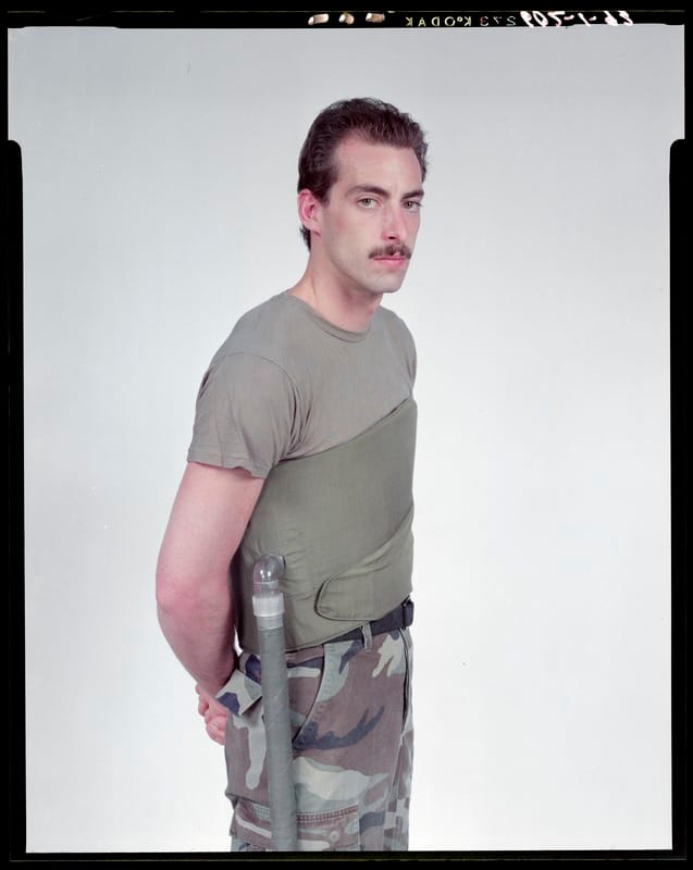 Flipping through this collection randomly can be jarring. One minute you see a pretty, smiling woman donning a Kevlar vest, then a tray of dehydrated processed beef, followed by a paratrooper with an anti-tank missile and then a metal casket in a grassy field.