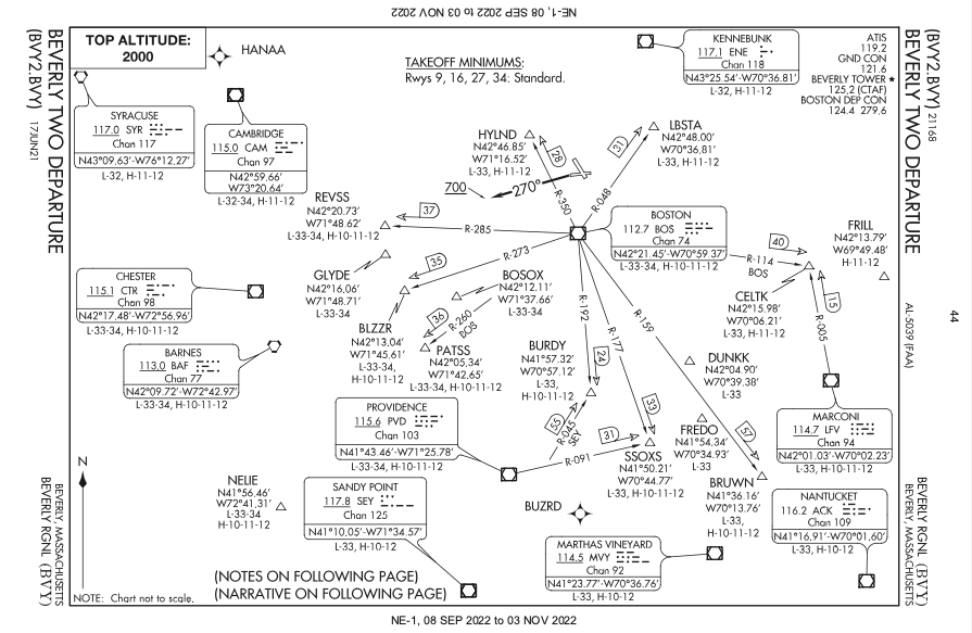 These waypoints are created with input from each airports’ ground controllers and they are quite colorful. Often these waypoint names will reflect the culture, food or sports teams of the city they are near. Off the coast of New England, there is LBSTA and WHALE. Boston’s sports legacy gave us BOSOX, BRUWN, CELTS, PATSS, FENWY, ORRRR and BORQE. Salem has WITCH, and Plymouth has PLGRM. Boston’s culinary traditions are not left out with CHWDH, CLAWW and of course DUNKK. Star Trek’s Spock was played by Boston native Leonard NIMOY, who was honored with an eponymous waypoint.