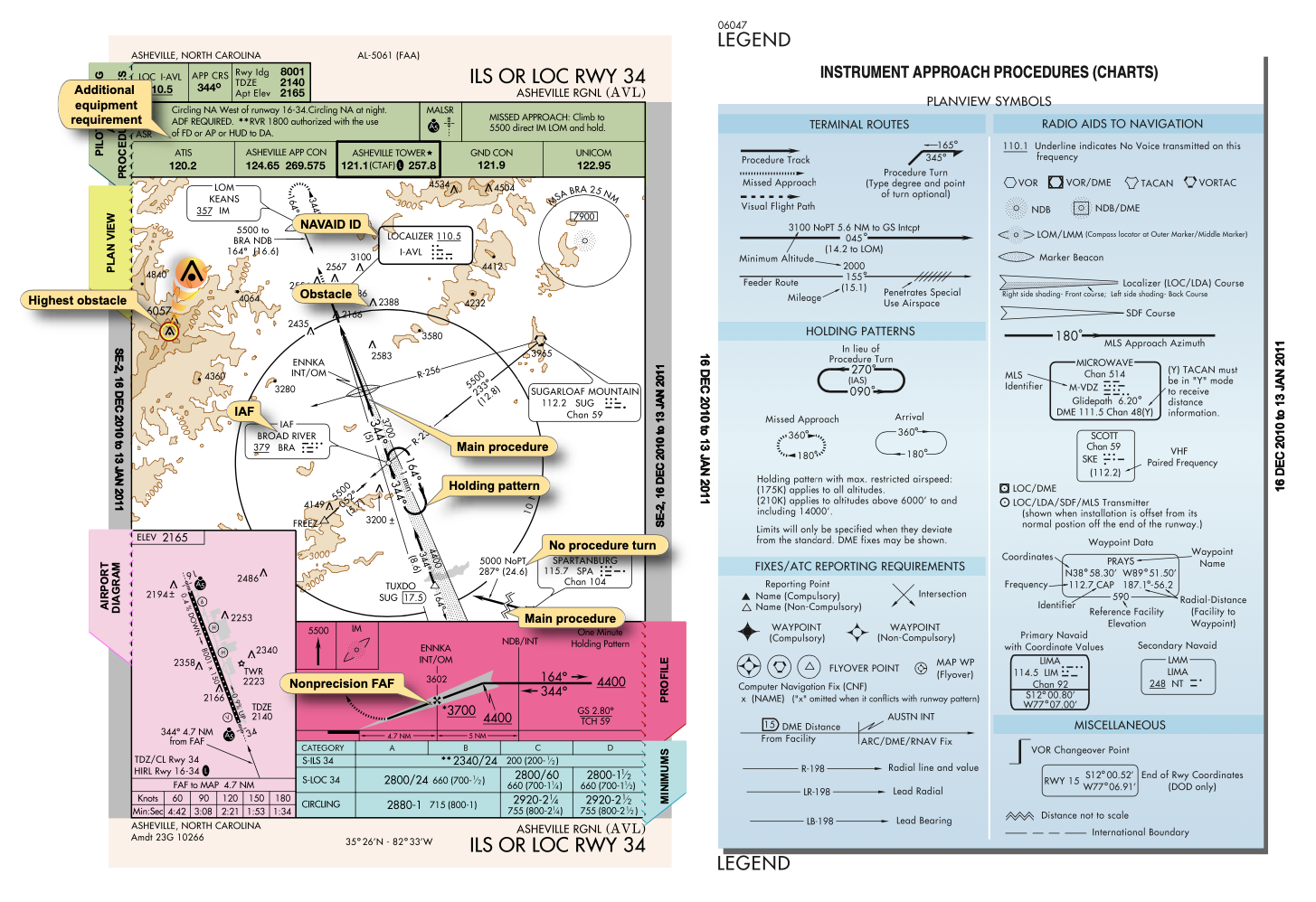 Detailed diagrams of each airport, along with adjacent geographical features such as lakes and rivers, runways and nearby navigational waypoints help pilots set their radios to the correct control tower frequency, approach from the correct direction, and takeoff and land along a safe flightpath. The maps include details about obstacles (and their height), runway lights, runway length and the procedures for handling a “missed approach”.