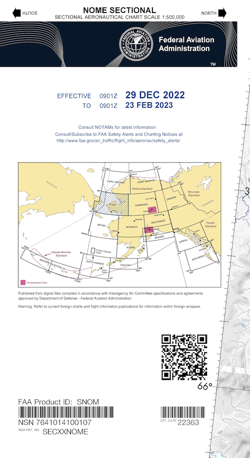 Left: Cover of the VFR Nome, AK sectional. Right: VFR map legend. Source: FAA.