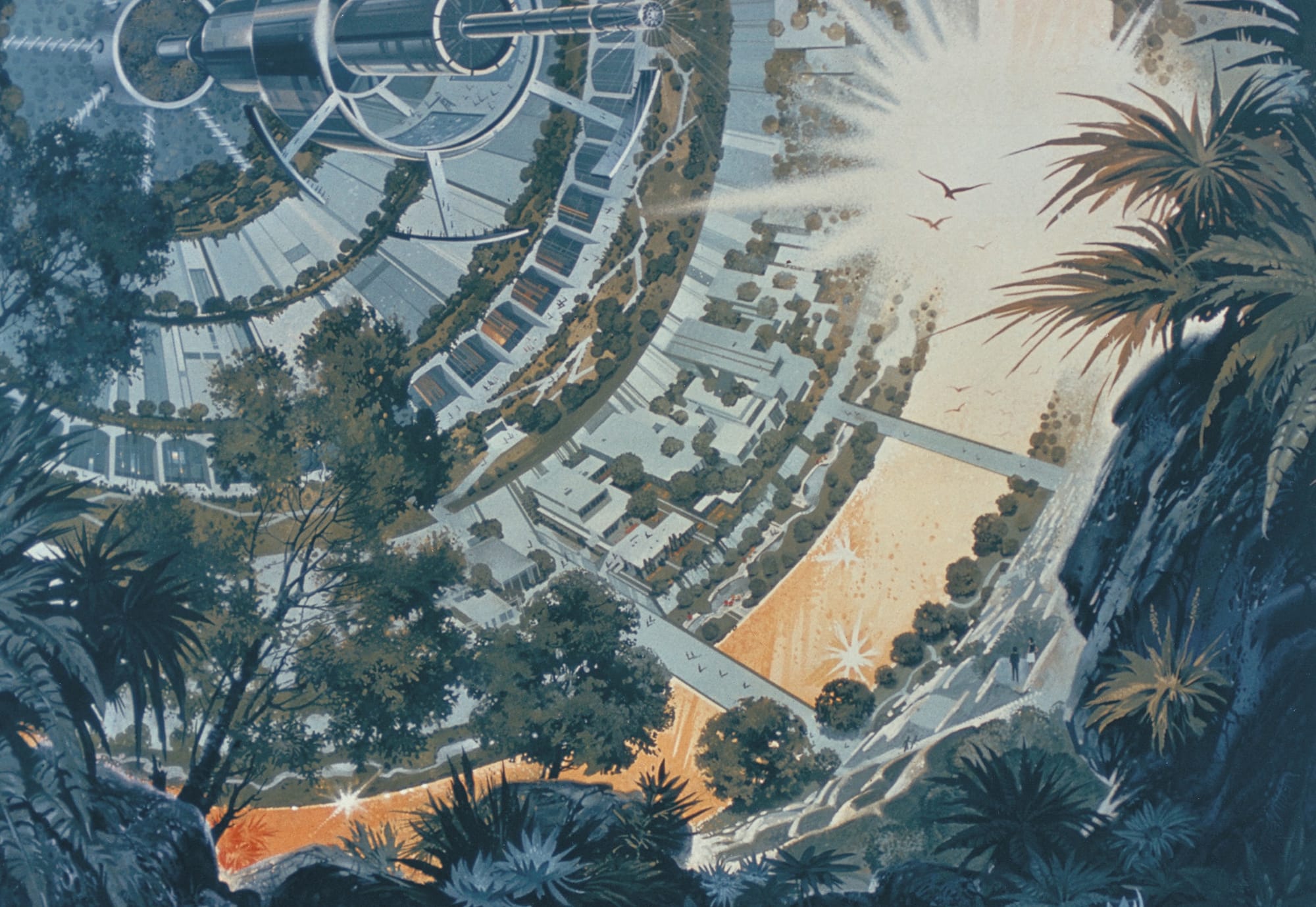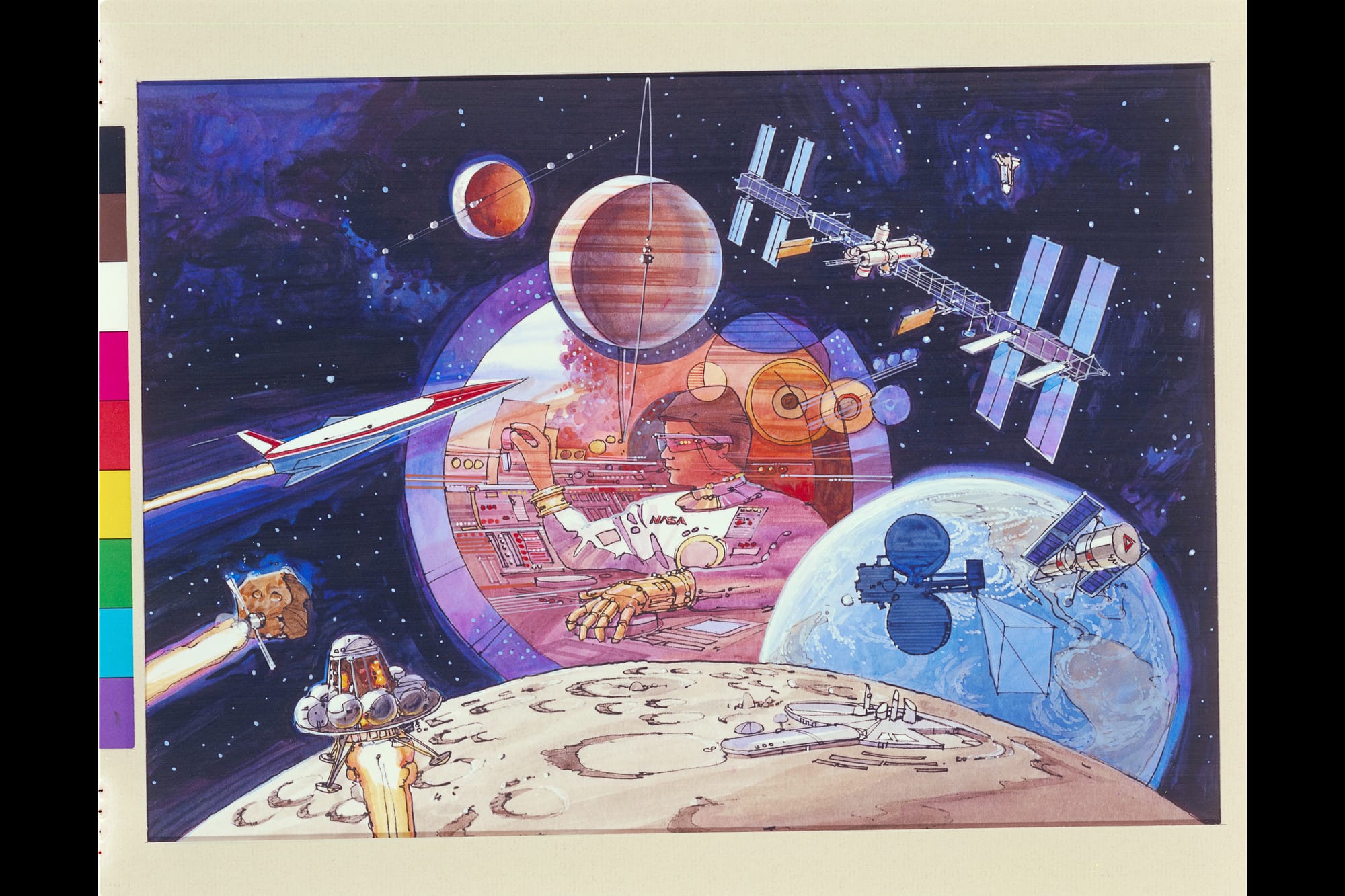 How do you get the public excited about multi-million dollar scientific missions that people can’t really see yet? Some amazing, awe-inspiring illustrations can be found in the Ames archives, depicting imagined surfaces of distant planets, NASA spacecraft descending into surreal alien landscapes, and fantastical depictions of future ring-shaped human habitats in space. You can feel the optimism and excitement of the time looking at these colorful illustrations.