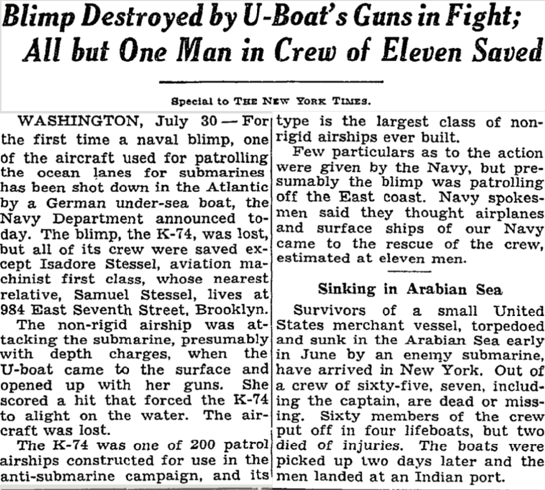 On July 31, 1943, The New York Times reported that airship K-74 was shot down over the Atlantic, after a U-boat it had been hunting with depth charges surfaced, and shot it down. All but one member of the crew survived the splashdown in the ocean.