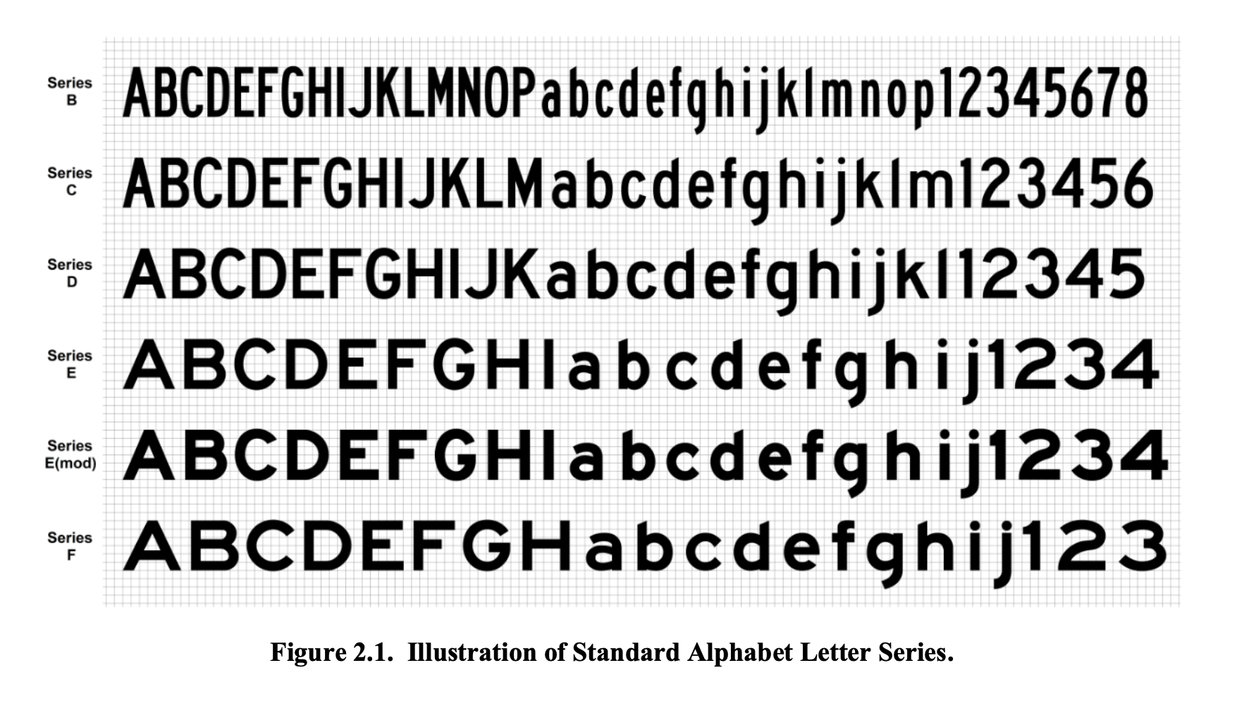 A specimen of the FHWA's "Standard Alphabet" typeface which is the current standard for traffic signage. Source: FHWA Report on Highway Guide Sign Fonts