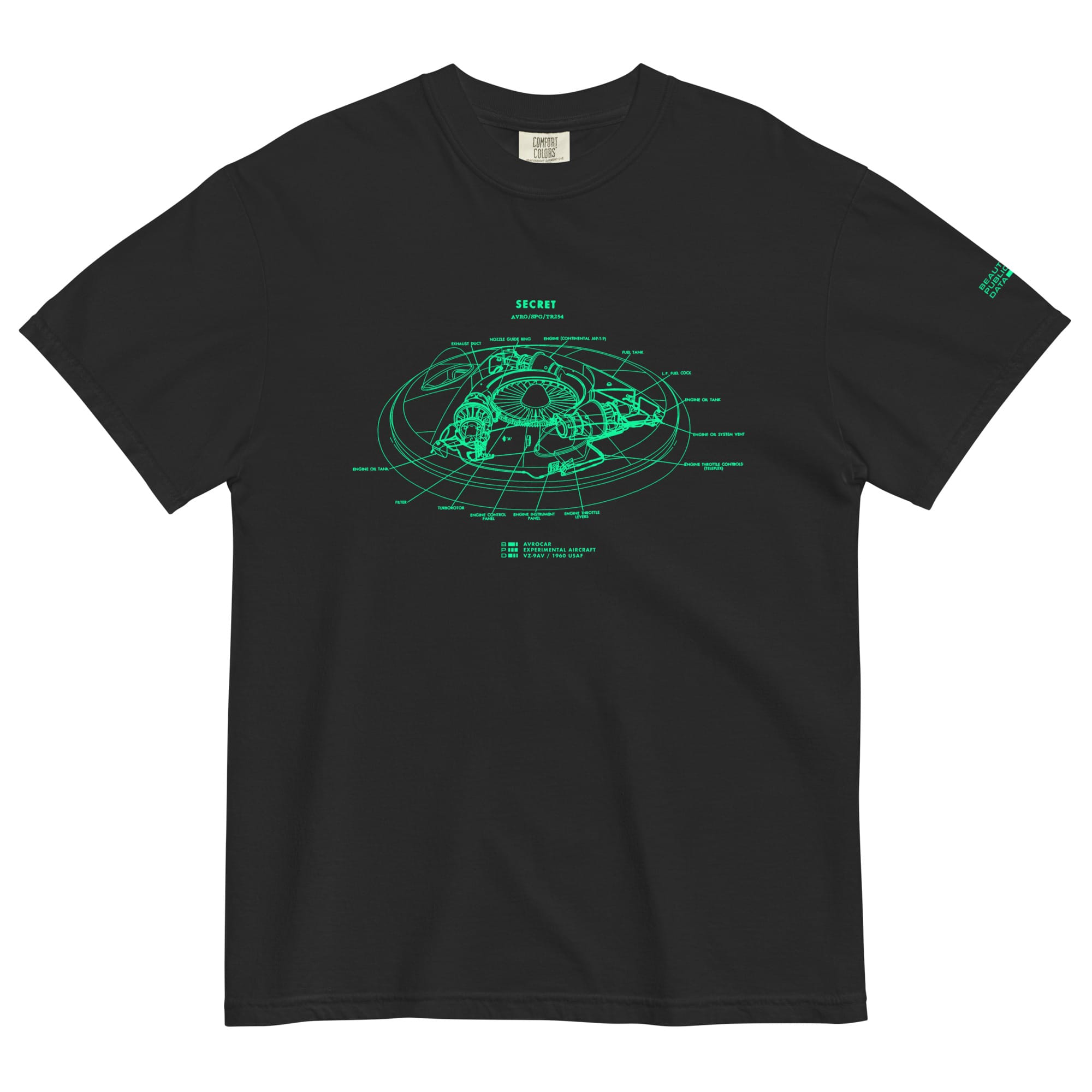 In 1960, the United States Air Force tested a top secret experimental aircraft shaped like a flying saucer known as the AVROCAR. From declassified public records, this schematic shows this UFO-shaped skunkworks craft that was cancelled after several test flights. Bright green ink on black, grey, purple and navy.