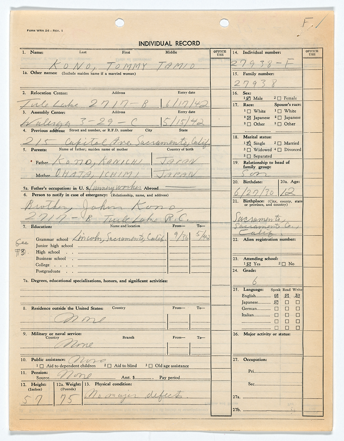 Individual Form 26 Record for Tommy Tamio Kono. Source: https://catalog.archives.gov/id/259485500