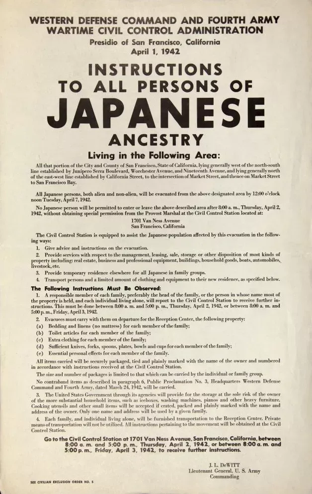 Two months after Japan attacked Pearl Harbor in Hawaii, on February 19, 1942, President Franklin Roosevelt issued Executive Order 9066, authorizing the roundup and mass detention of Japanese Americans living on the west coast of the United States. The order granted the military broad authority to divide the western United States into military zones, from which “any or all persons may be excluded.”